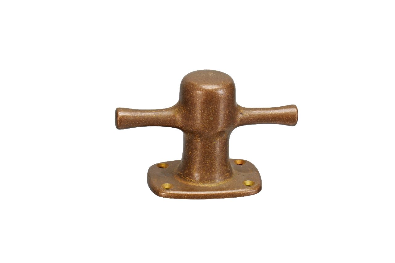 Heavy-duty mooring bitt with bar. Traditionally shaped with a distinctive, lively appearance. Versatile in use. Well suited as a central bow bitt on cutters and workboats. The smaller version is also suitable for mounting on leeboard guards (aanvaringsklamp) of medium-sized dutch sailing barges, serving as an auxiliary or centre bitt.