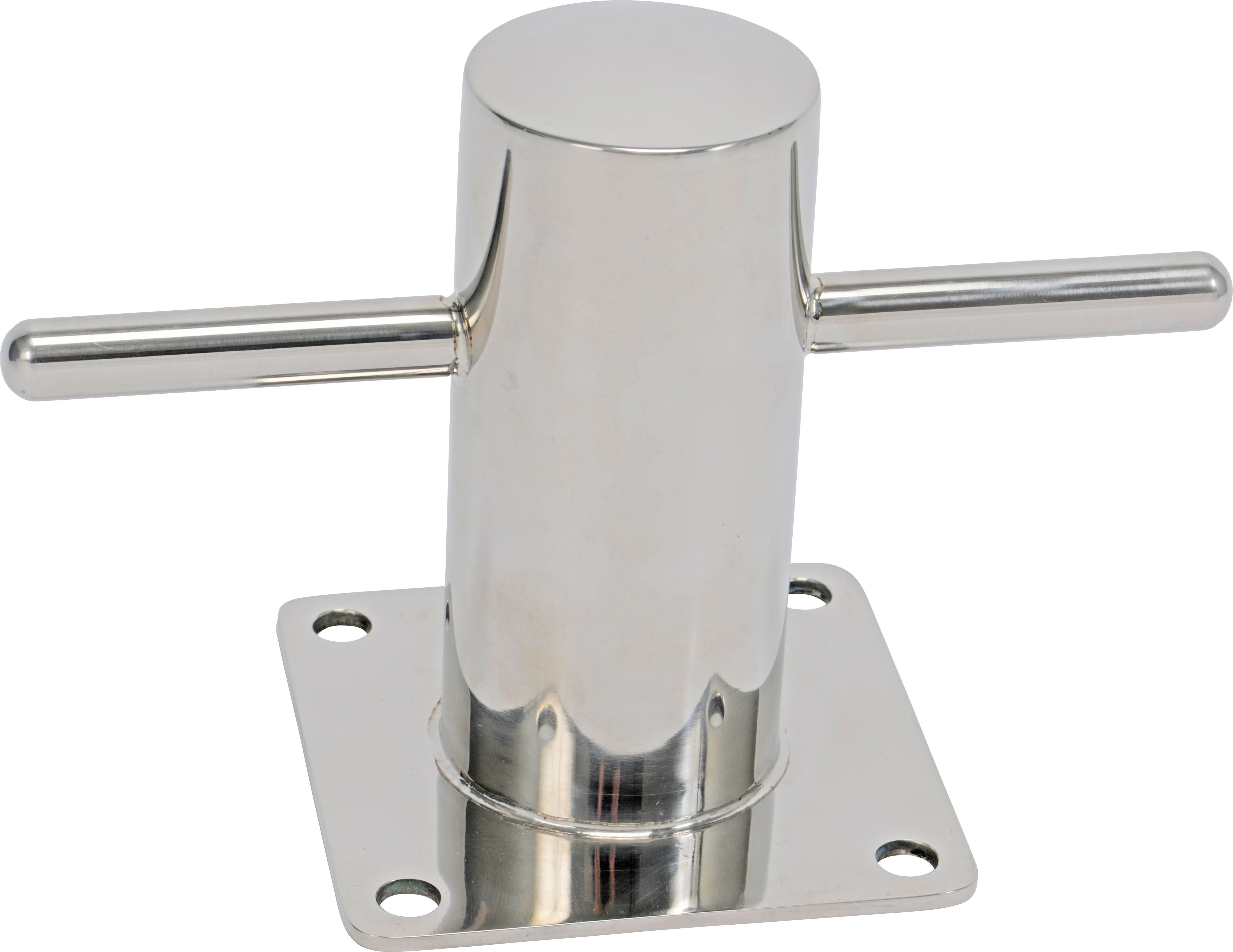 Bollard made of A4 stainless steel (1.4401), welded, with extra long cross piece. The particularly strong base plate is 5 mm thick and has 13 mm mounting holes. The bollard is ideally suited for marinas.