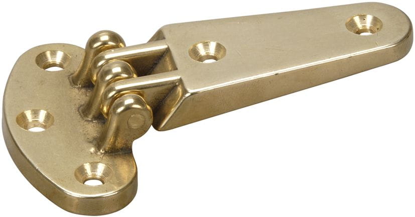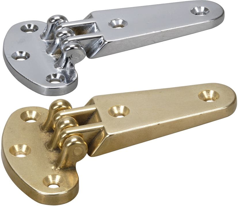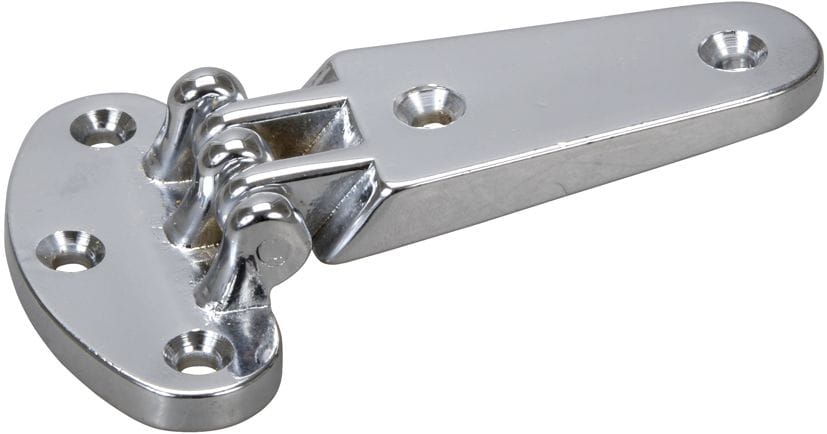 Lightweight polished or chrome-plated brass T-shaped strap hinge with raised (cranked) leaf.