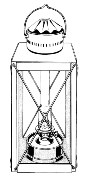 Replica of the cargo lamps used in earlier centuries on cargo ships. The lantern is made of brass, glazed all around and thus windproof. A cross of brass rods on each side protects the glass panes. The electric lights can be hung from the bracket, the kerosene light serves as a table lamp or portable lantern.