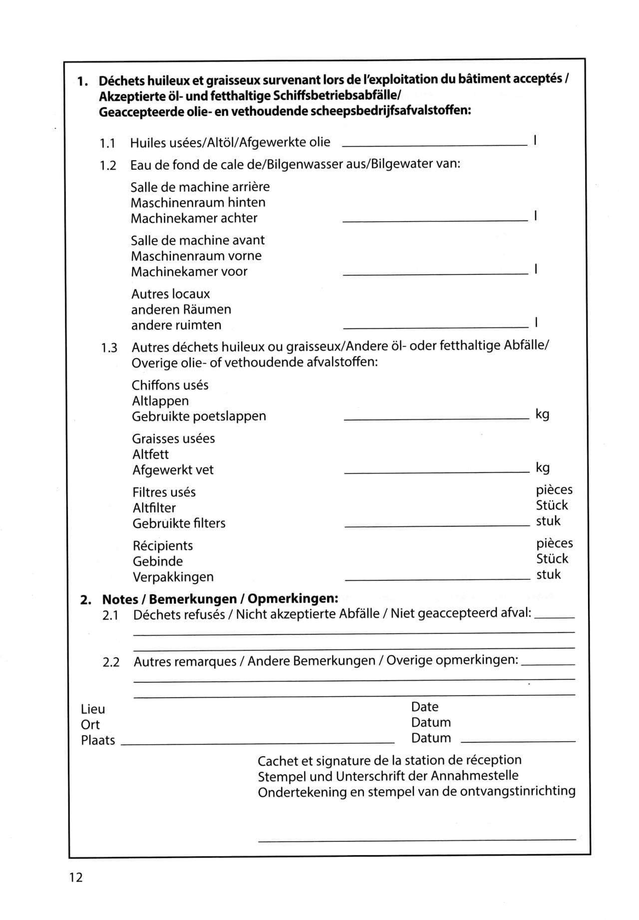 The oil control book must be carried on board to document the discharge of waste oil, bilge water and other waste containing oil or grease. It is written in three languages: French, German and Dutch.