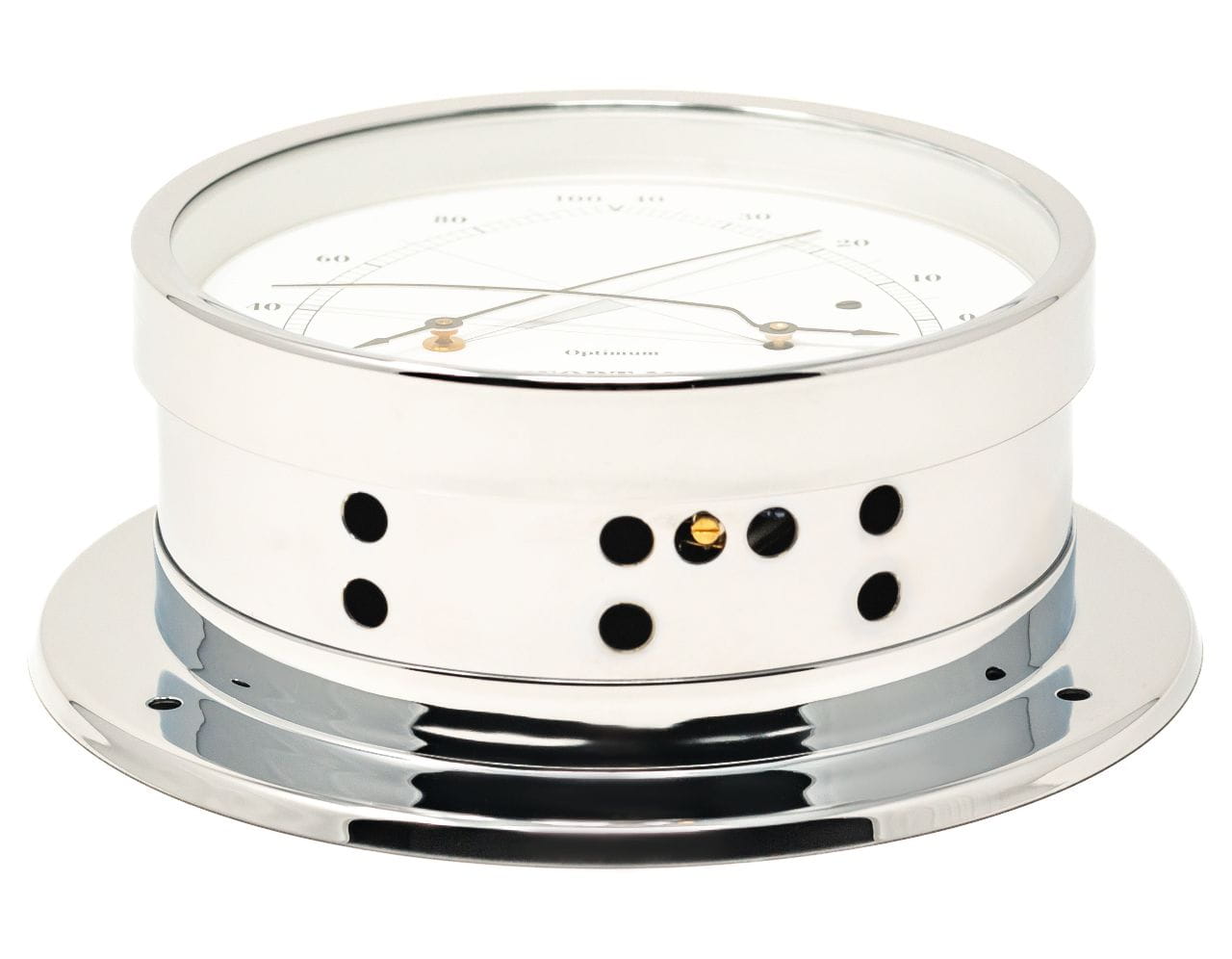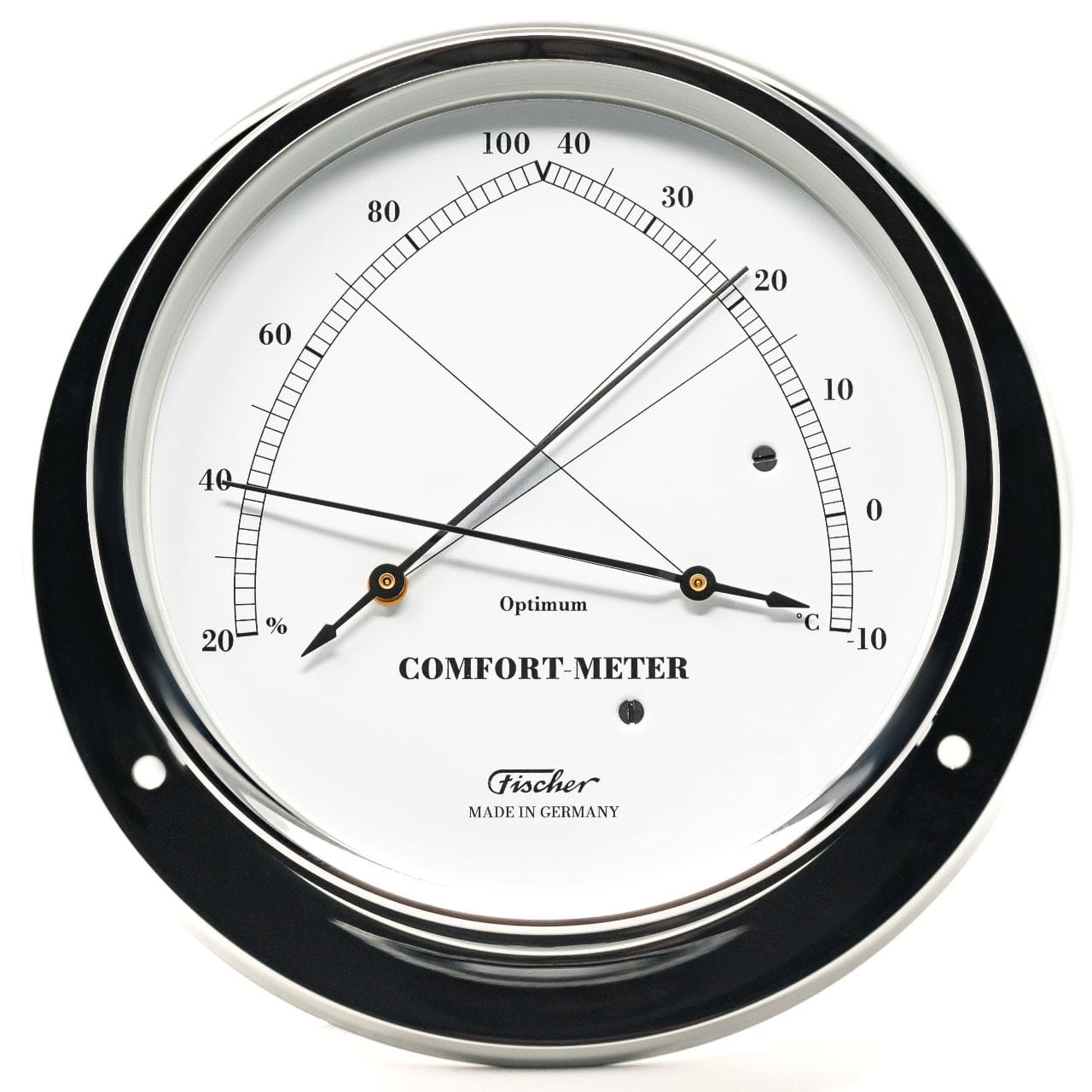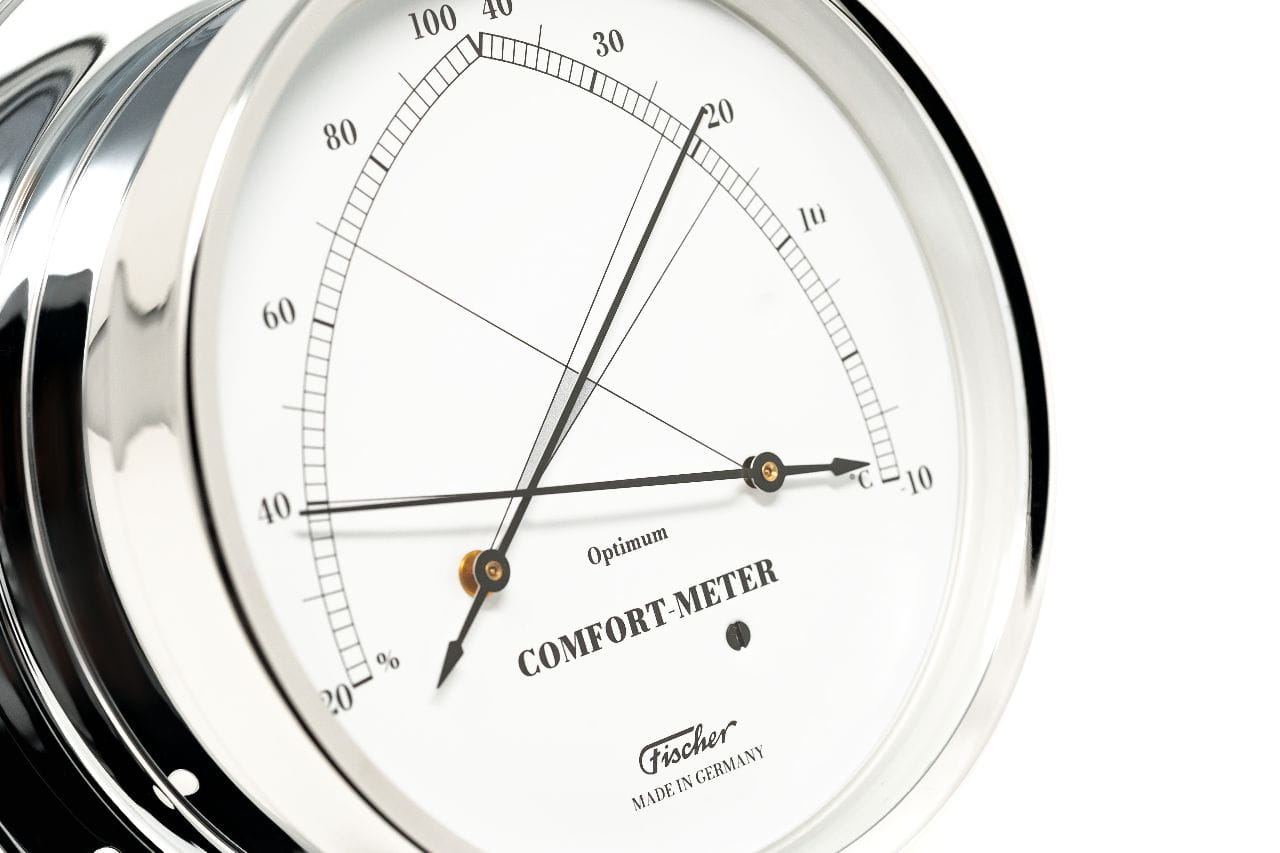 Maritime comfort meter with thermometer and hygrometer from the FISCHER 1610 instrument series, for indoor use. The housing is made of chrome-plated brass and has a mineral glass cover with a diameter of 132 mm.