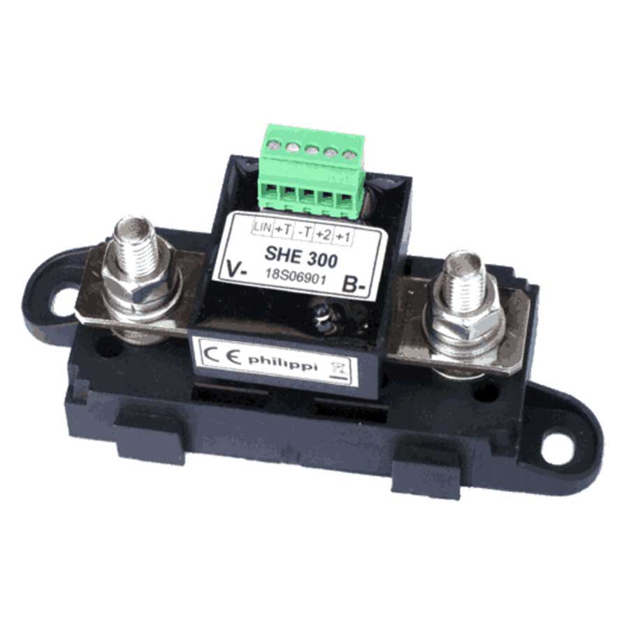 The optional digital battery shunt SHE348 is installed in the negative lead of the consumer battery. With the SHP348 shunt, further current measurement for charging sources (solar) is possible. Both shunts are supplied with power via the voltage measurement line of the connected consumer battery. The shunts are suitable for continuous charging or discharging currents up to 300 A and battery capacities up to 1000 Ah.
