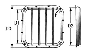 Heavy square brass deck hatches, with a polished or chromed finish.
