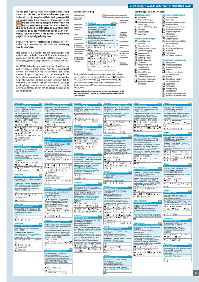 The ANWB Wateratlas Nederland combines the well-known ANWB water charts with information from the Wateralmanak Part 2 for navigation on lakes and rivers about marinas and operating times of bridges and locks in a compact, spiral-bound format. There is a water atlas for Nederland noord, midden and zuid.