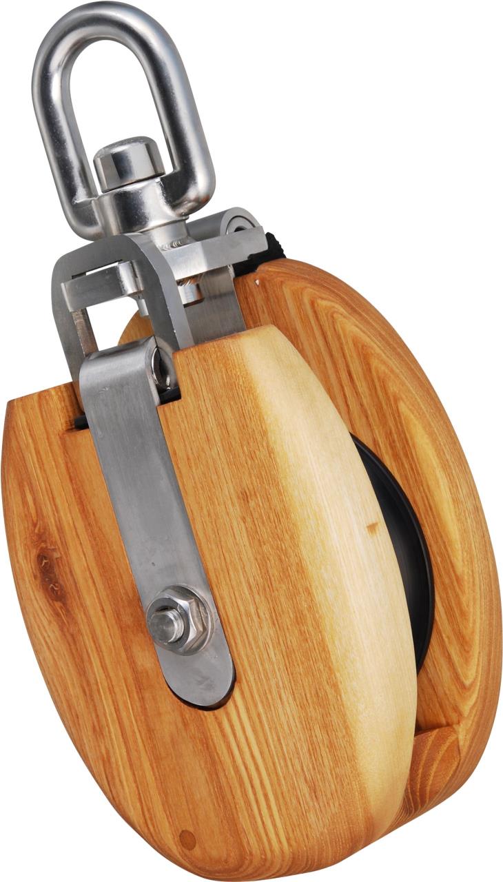 Traditional snatchblock with swivel, block housing made of ash wood. Fittings made of stainless steel (AISI316) with a matt blasted surface that gives the impression of hot-dip galvanising. Sheaves made of high-strength, self-lubricating, black ERTACETAL plastic.
