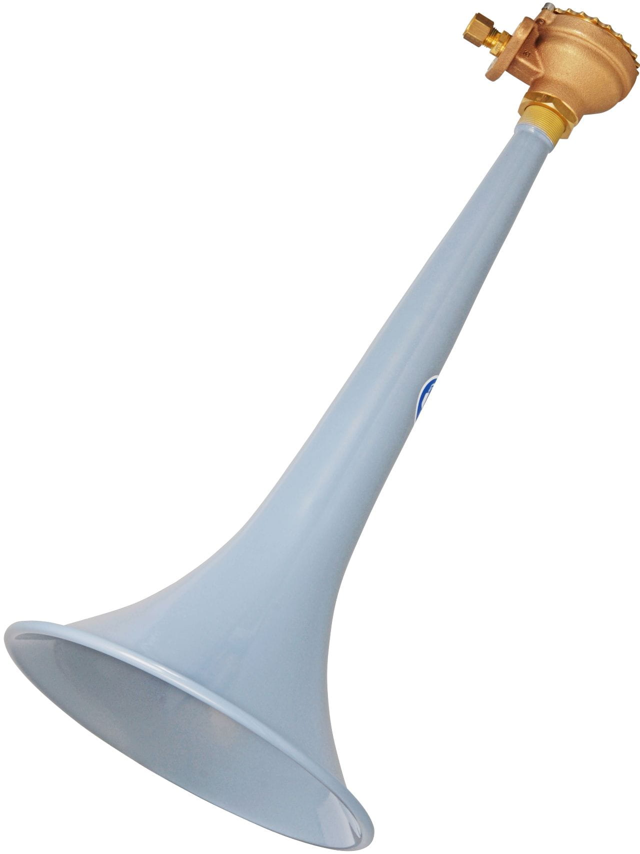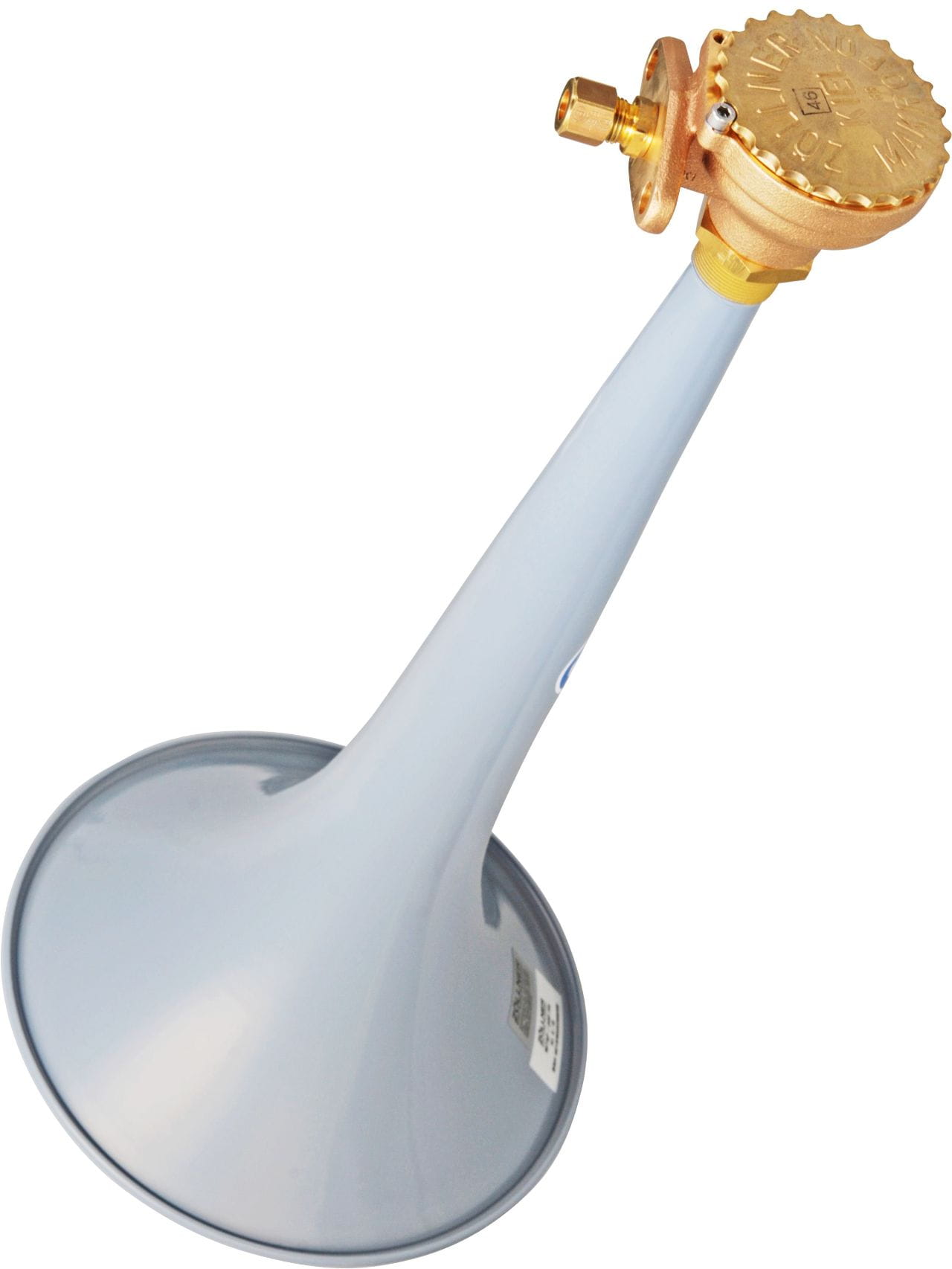 The MAKROFON M75F/260 HVEF is a compressed air sounder that generates sound via a diaphragm and damping plate. The signal (pleasant low tone) is triggered via an electromagnetic valve.